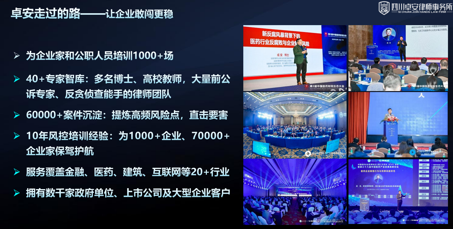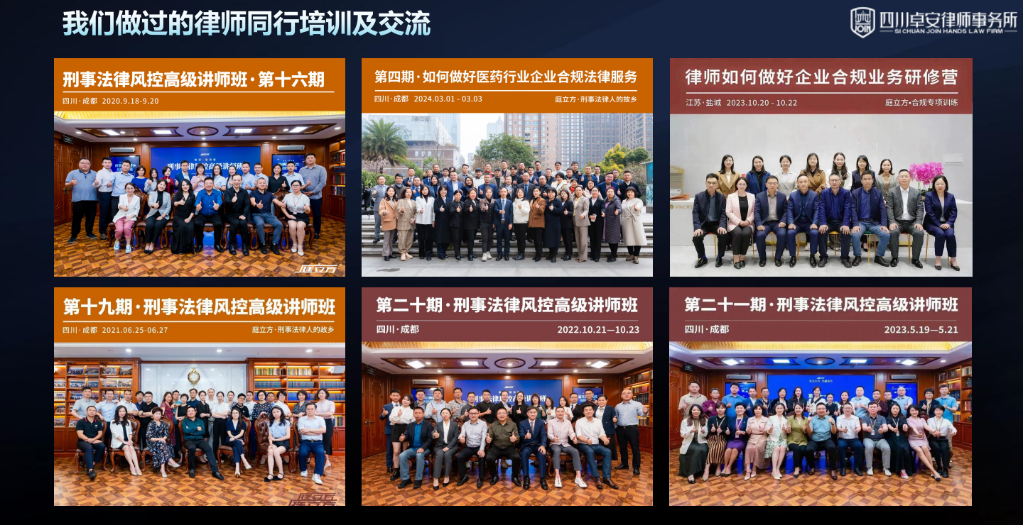作为刑事法律的传播者,四川事务所秉持“预防为先”的风控理念,拥有10年专业风控培训经验,累计为企业家和公职人员开展刑事法律风险培训1000+场,为1000+企业、70000+企业家提供合规培训服务,让刑事风控理念深入企业经营各环节。