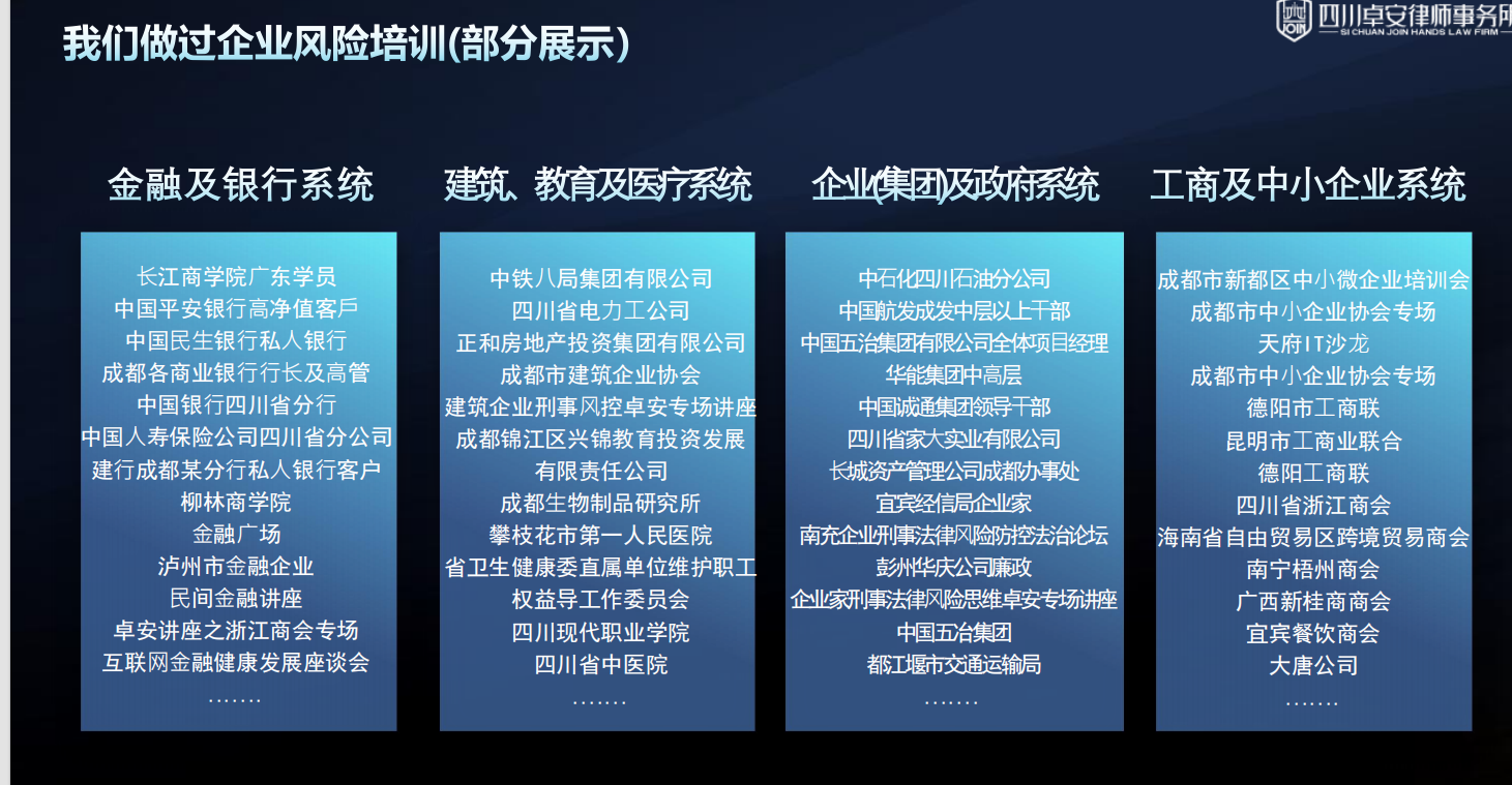 1. 金融及银行系统:为中国平安银行高净值客户、中国民生银行私人银行、中国银行四川省分行、中国人寿保险公司四川省分公司等机构开展专项培训,聚焦金融领域商业贿赂、涉税风险、资金合规等核心问题;
