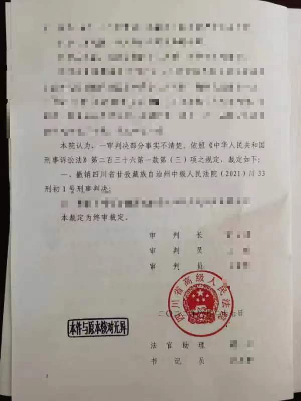 裁定: 四川省高级人民法院采纳了何冰冰律师的关键辩护意见,认为原审判决事实认定存在重大疑问,最终裁定:撤销四川省甘孜藏族自治州中级人民法院刑事判决,发回重审或指令纠正。