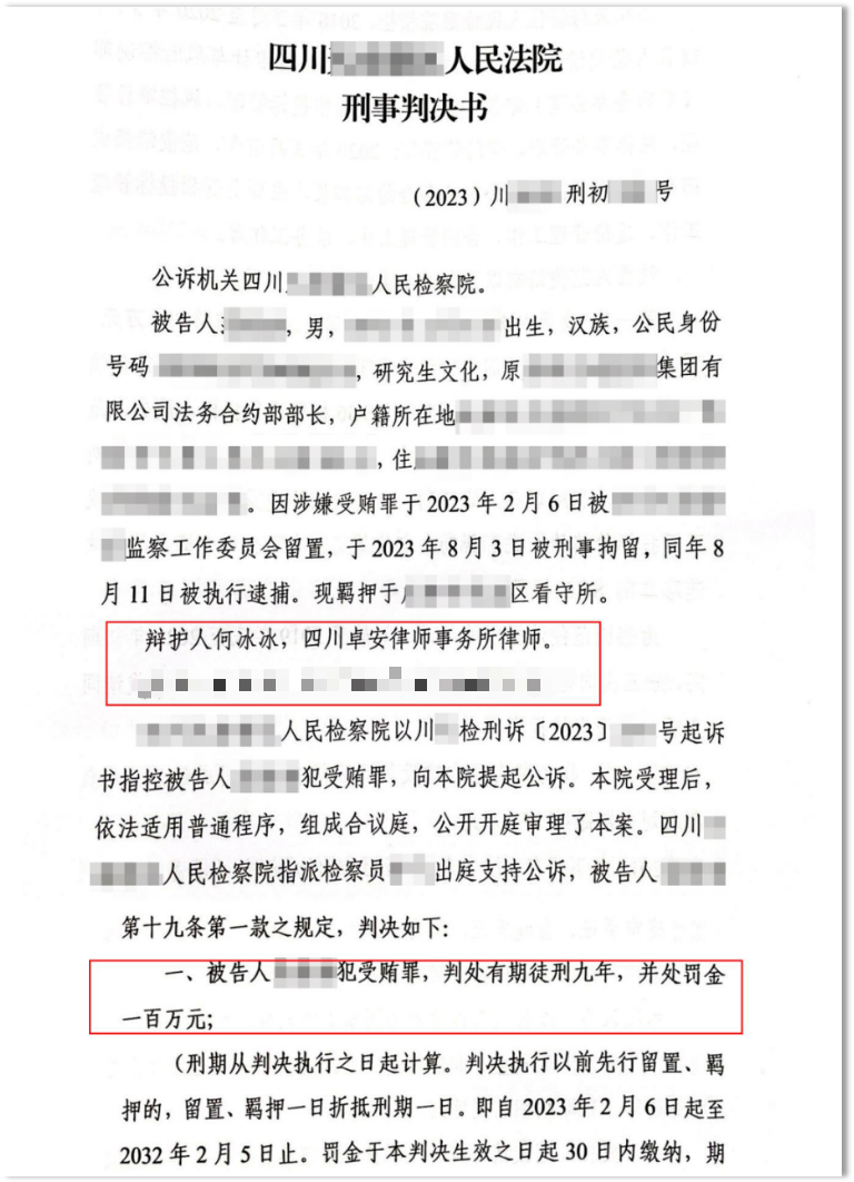 辩护效果: 最终,法院全面采纳了关于F某构成自首、积极全额退赃、系初犯偶犯等核心辩护意见,打破了“千万受贿,十年起步”的常规预期,判处F某九年。这一判决,是在法定最低刑以下量刑,实现了辩护工作的“极限突破”,为当事人在绝望中争取到了最宝贵的希望。