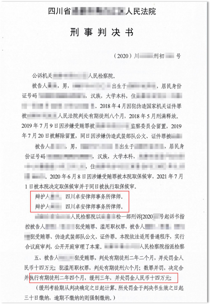 人民法院审慎合议庭评议后,全面采纳四川事务所辩护意见:依法大幅核减受贿指控金额,认定当事人地位。数罪并罚后,法院对某作出二年四个月,三年的判决,当事人免予收监执行,宣判后直接与家人团聚。