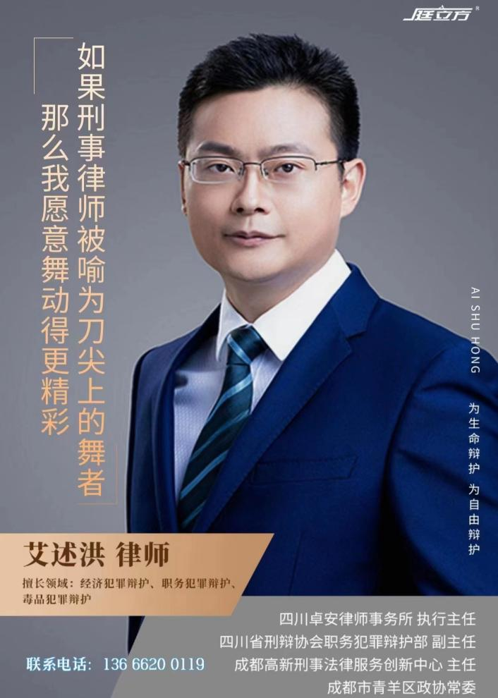 艾述洪,四川卓安律师事务所执行主任、创始合伙人,四川大学硕士研究生,高级律师,青羊区政协常委,卓安经济犯罪研究中心主任,卓安刑辩文化馆执行馆长。 四川省首批刑事专业律师,荣获“四川省优秀青年律师”“成都市优秀律师”称号。成都市人民检察院听证员,成都市公安局党风政风警风监督员,成都市公安局监所管理支队律师监督员。 执业以来一直专注于刑事法律服务,作为“刀尖上的舞者”,承办过多类复杂刑事案件,特别擅长办理破坏经济秩序、侵犯公民人身权利、侵犯财产和妨害社会管理秩序等案件。 艾述洪律师十多年来一直以刑事辩护、控告和刑事法律风险识别与防范为研究、实践的重点;作风严谨、细腻,责任心强,在办案中,善于发掘更有利于被告人的辩护思路,不轻言放弃,尽一切可能维护当事人的合法权益。执业期间参与办理刑事案件近千件,通过各方积极努力,其中百余人被依法取保候审,诸多案件当事人因不起诉或不构成犯罪等被依法释放,或依法判处缓刑,通过不懈努力,部分案件法院开庭后由检察院撤回起诉予以释放,或依法判决无罪。