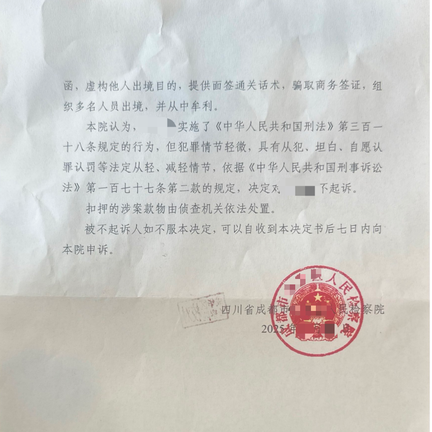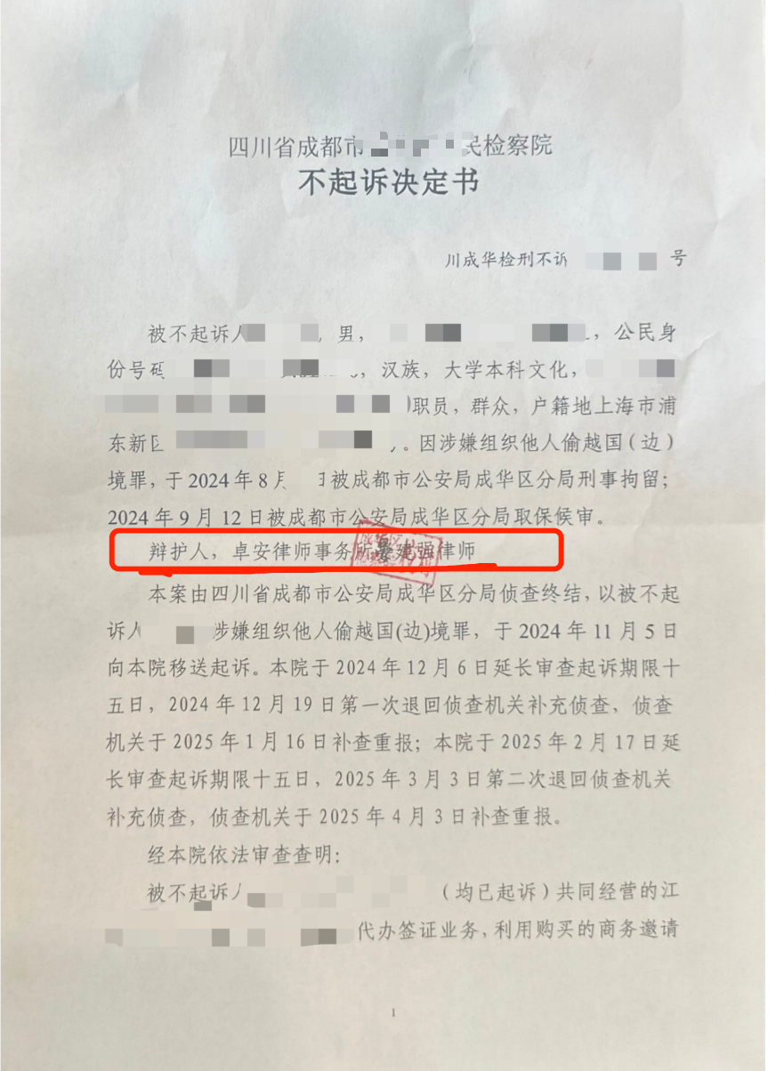 封面语:X 某某作为旅行社基层操作员,因参与办理 “商务包签” 签证涉组织他人偷越国(边)境罪。艾述洪、晏建强律师介入后,通过论证案件定性争议及多项从宽情节,成功为其争取不予起诉。