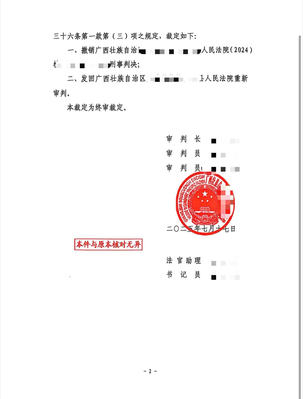 2025 年 7 月 17 日中级人民法院作出刑事裁定书,以原判决事实不清、证据不足为由,撤销一审判决,发回重新审判。