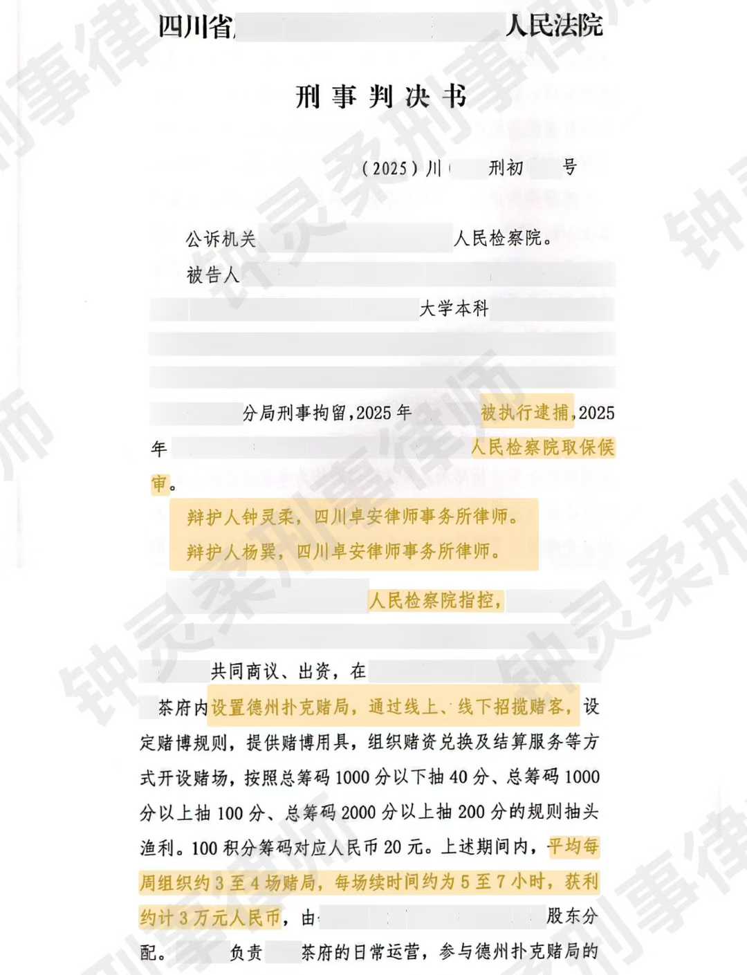 当事人作为茶楼股东,在茶楼内组织打德州扑克,抽头获利3万元,被挡获归案。
