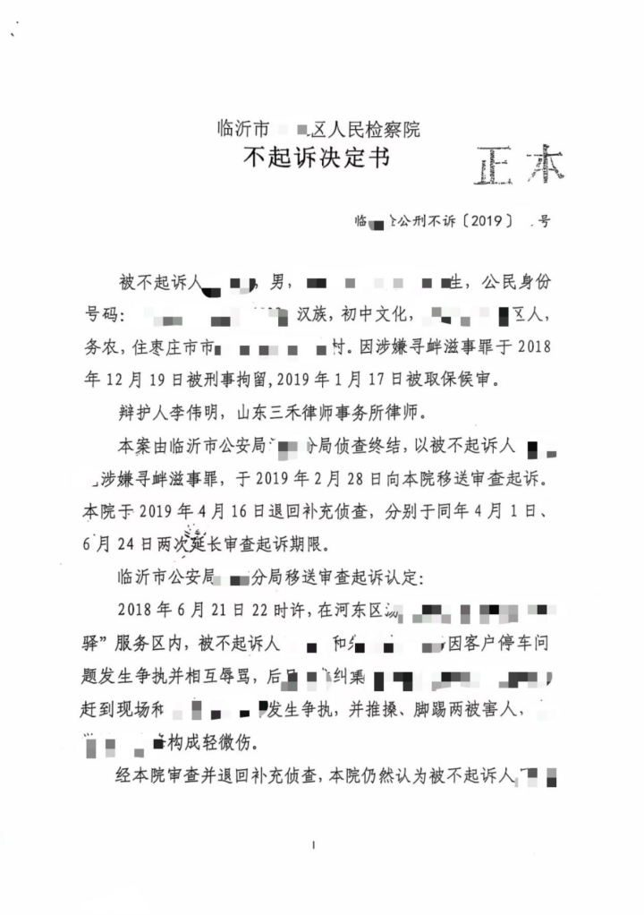 L某某涉嫌一案,山东三禾律师事务所李伟明律师为其辩护,获不起诉决定。