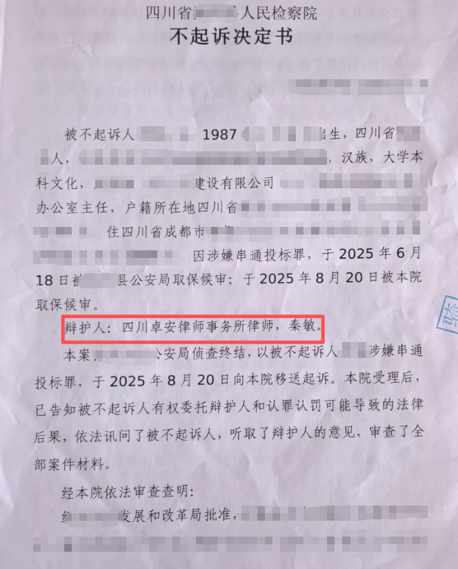 封面语:L某涉嫌串通投标罪一案,四川事务所秦敏律师在审查起诉阶段围绕主观故意缺失、违法所得证据不足、行为社会危害性轻微等核心问题展开辩护,成功论证其从犯地位及情节轻微,结合退赃等情节,最终检察院作出不起诉决定,最大限度维护当事人合法权益。
