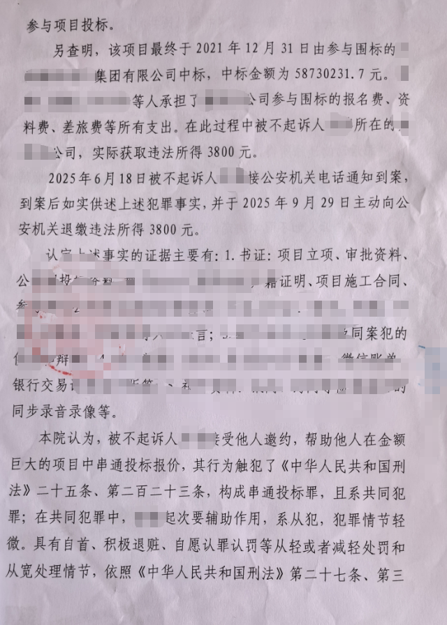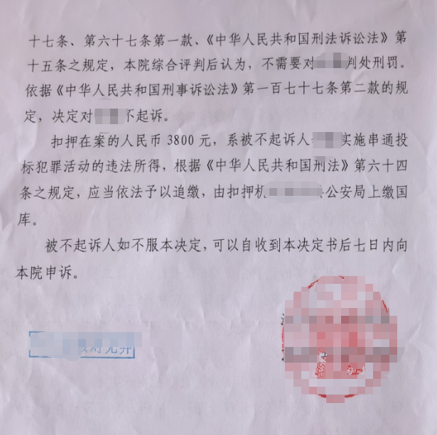 - 结果:检察院认定构成串通投标罪但情节轻微,作出不起诉决定。