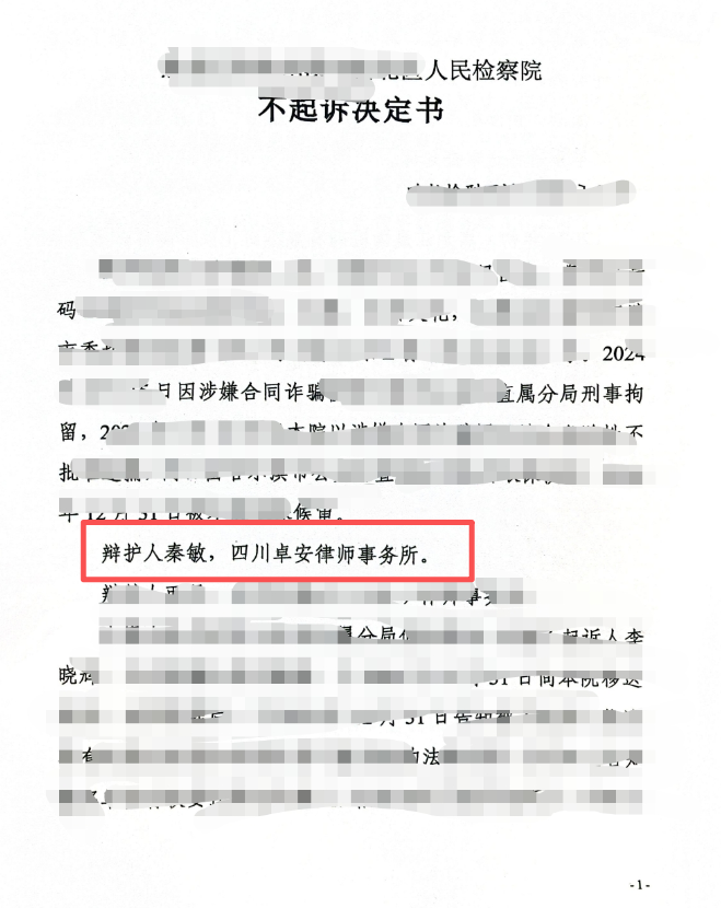 - 封面语:L某涉嫌合同诈骗罪一案,四川卓安律师事务所秦敏律师介入后,耗时多日整理数百页有利证据材料,跨越 2000 多公里多次与检察官当面沟通,围绕案件核心争议精准辩护。通过扎实的证据呈现与反复沟通论证,成功推动案件两次退回公安补充侦查,最终促使检察院作出不起诉决定,全力维护了当事人合法权益与企业正常经营。