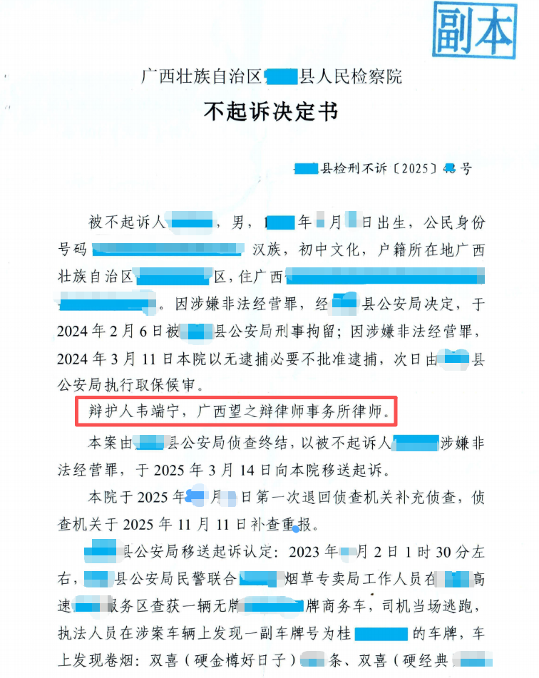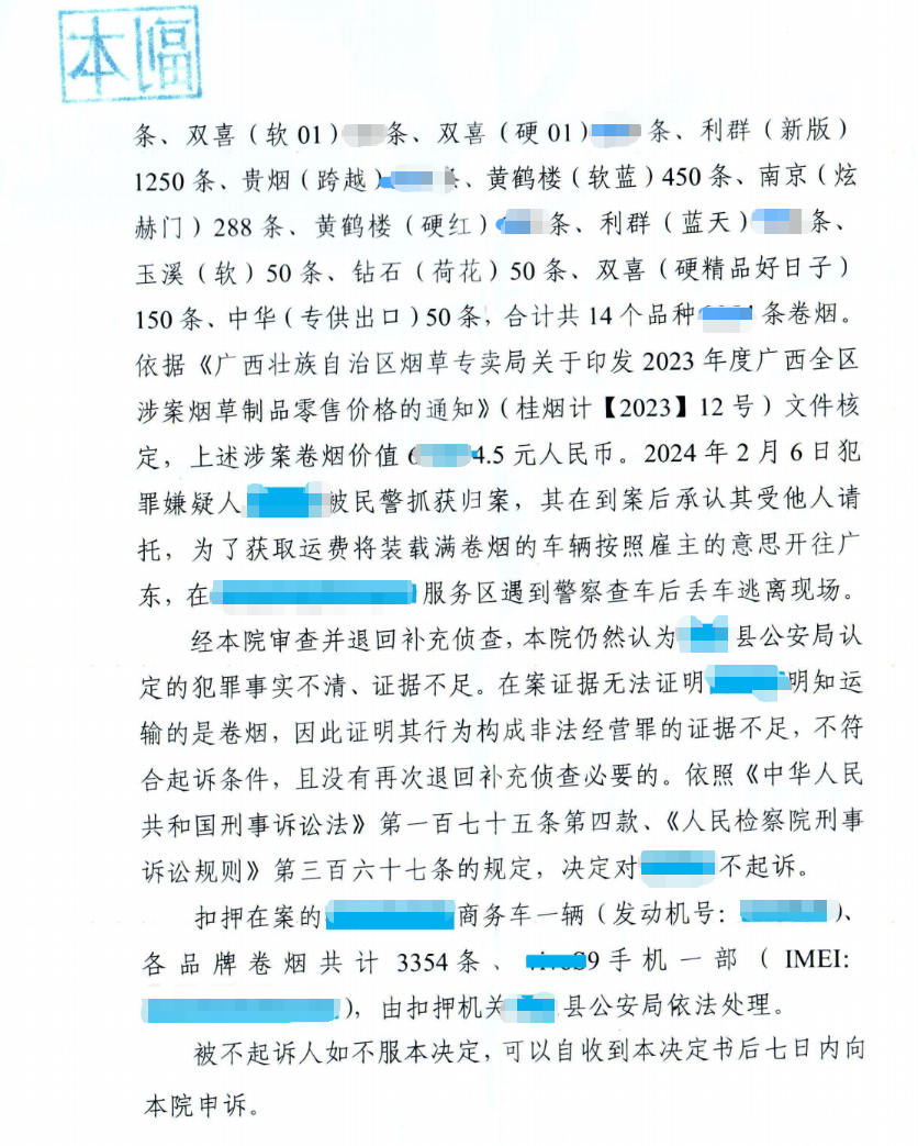 关于H某无证运输卷烟涉嫌,广西望之辩律师事务所韦端宁律师在审查起诉阶段为其辩护,检察院作出不起诉决定。