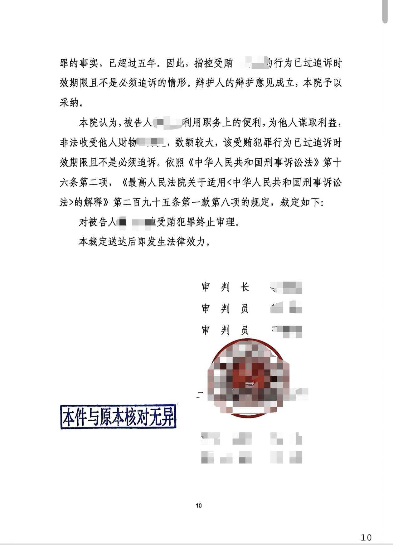 受贿罪部分:法院刑事裁定书,认定已过追诉时效,裁定终止审理,该罪名不再追究刑事责任。
